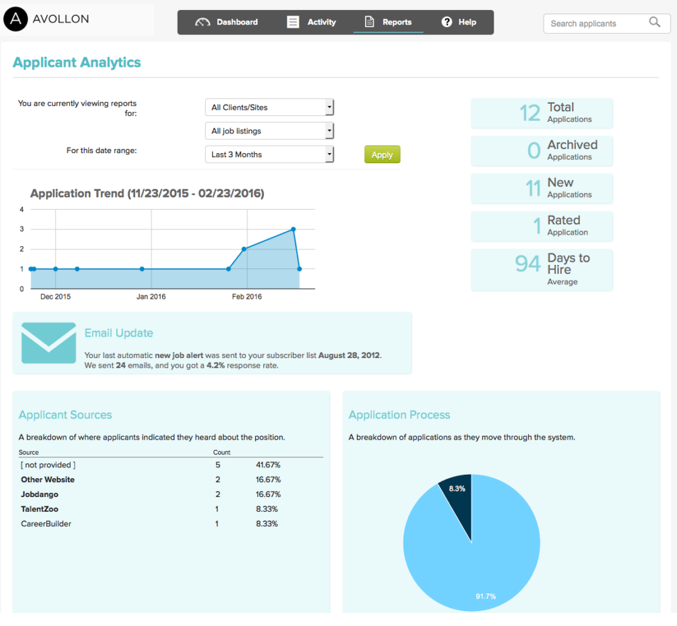 Tracking recruiting is essential. The recruitment analytics dashboard within Avollon ATS allows you to view key data at a glance and monitor recruitment analytics, such as cost-per-hire, time-to-hire, application-per-source and many more.